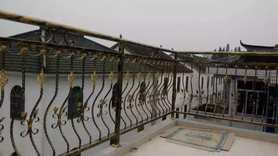 欄桿由黑色金屬制成,設(shè)計非常精致,充滿了復(fù)雜的卷曲和花紋圖案,并且在一些關(guān)鍵部位有金色的裝飾,增添了一絲華麗感。欄桿的頂部有一條仿木質(zhì)扶手,給人一種典雅而復(fù)古的感覺。