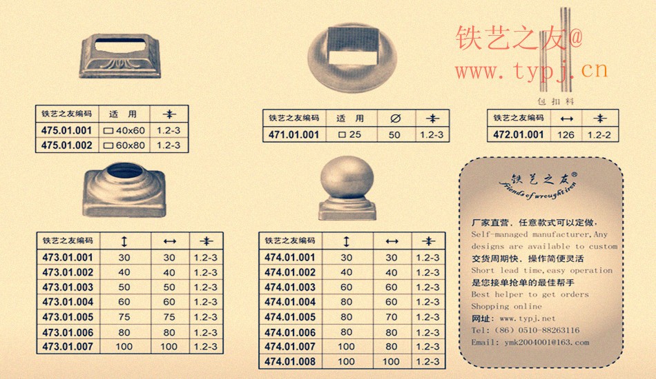 鐵藝之友專業(yè)欄桿裝飾蓋.方管裝飾蓋子.護(hù)欄收口蓋.鐵藝裝飾蓋.鐵藝收口蓋子.腳蓋.扣蓋.鋼管封口蓋子.方管收口蓋。等鐵藝相關(guān)配件的設(shè)計(jì)制作。產(chǎn)品廣泛應(yīng)用于企業(yè).學(xué)校.賓館.小區(qū).庭院等的鐵藝工程。產(chǎn)品款式豐富,款式新穎,做工精致,價(jià)格合理,是您鐵藝企業(yè)接單,搶單的最佳助手。特殊產(chǎn)品款式可以來樣來圖制作,自營工廠品質(zhì)保證,價(jià)格保證。常年供貨國際市場。產(chǎn)品豐富,價(jià)格合理,歡迎訂購。