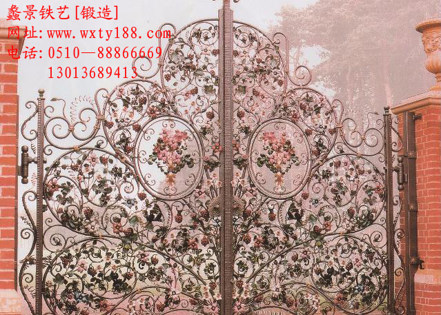 該款編號為TYM-009型號的鐵藝大門是無錫鐵藝護(hù)欄廠為精品花園、庭院精心設(shè)計的一款精致奢華的鐵藝大門。它是一款歐式的具有仿古氣息的鐵藝門,該鐵藝門做工復(fù)雜、精細(xì),該鐵藝大門門軸周圍的彎花、門上兩個橢圓以及中間的一簇鮮花配件裝飾物都是該大門的一大特色。裝飾栩栩如生,細(xì)致到每片葉子上都有經(jīng)脈的紋路。細(xì)節(jié)處也沒漏掉分毫。顏色選用合理,此種漆可以使用多年,但仍色澤艷麗。這樣的設(shè)計雖然費(fèi)時費(fèi)工,但是其設(shè)計新穎,工藝精美,時尚豪華 ,工藝一流。是一款較適合精美花園。別墅、庭院的鐵藝大門。聯(lián)系電話:13357919616