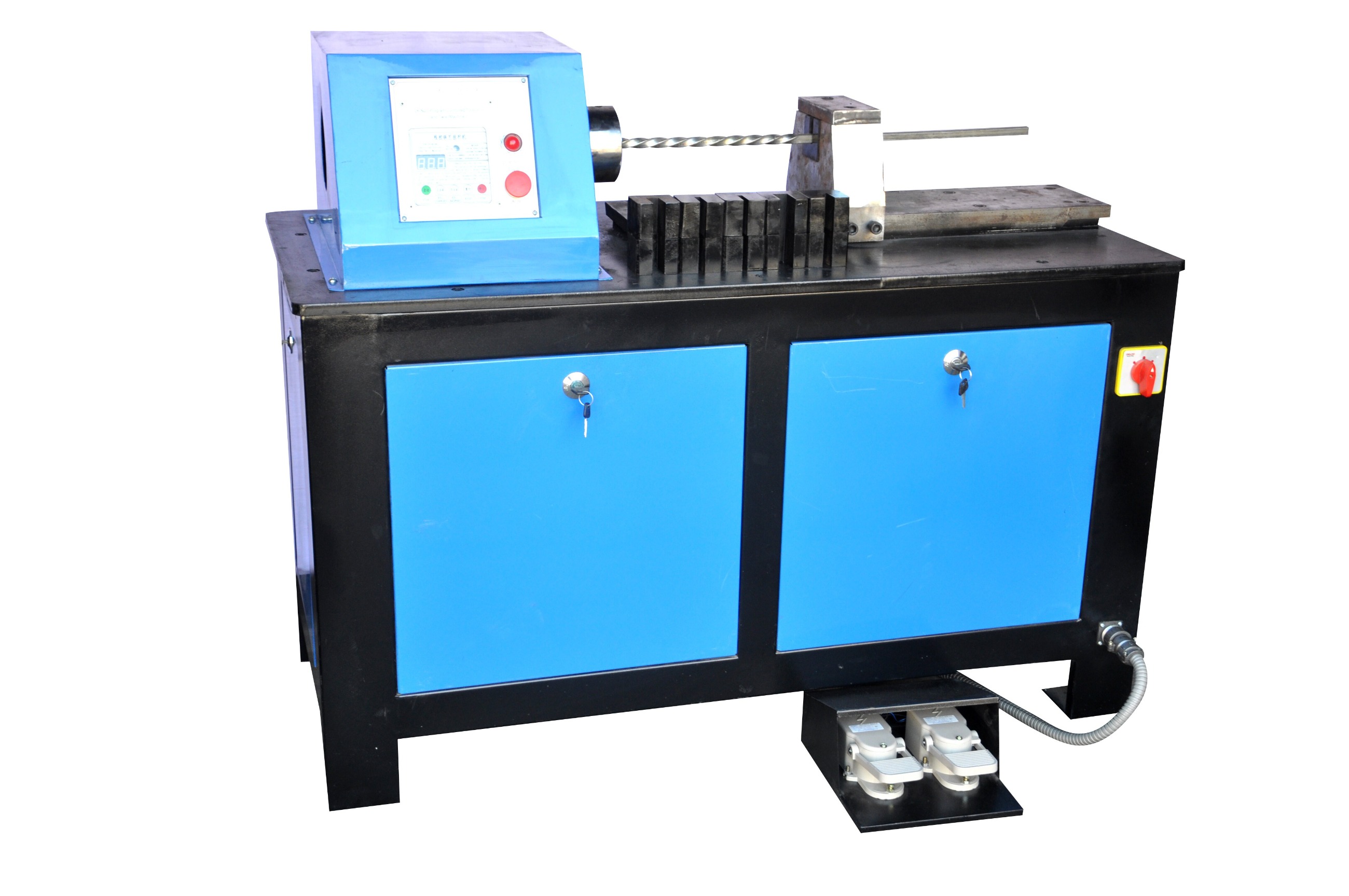 TNQ-20 and TNQ-25 twisting machines can twist the square steel, flat steel, etc. metallic materials into screw thread pattern, and meanwhile guarantee the high efficiency batch production and the standardization of twisted product. Such machine can also be equipped with the lantern auxiliary unit manufactured by our factory to twist lantern (birdcage), it is simple in installation, saving labor, and easy to operate; such machine can also be equipped with the fishtail auxiliary unit manufactured by our factory to coin fishtail pattern as well. The TNQ-25 is a new type reinforced equipment with processing capacity large than the TNQ-20. TNQ-20B and TNQ-25B are the new type equipment which are controlled by microcomputer and operate with high accuracy, large batch processing and automatic reckon by the piece, therefore are the ideal equipment indispensable to specialized batch production.